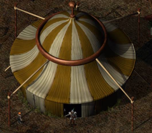 Перед цирком на Променаде я увидел стража, который сообщил мне, что цирк захвачен, и оттуда никто не возвращался. Я бы с радостью разведал, что к чему, но только не сейчас...надеясь, что я поступаю правильно, я потратил около 11,000 золотых монет на две вещи, которые были мне необходимы: магическую пращу +2 и браслеты Защиты КБ3 (Bracers of Defense AC 3). Эти браслеты, насколько мне известно, являются лучшими в своем роде; я никогда не смогу найти что-то лучше них, и они необходимы каждому, кто не может носить броню. Покупки оказались совершенными не зря: цирк был захвачен гномом-иллюзионистом, который наполнил его тенями и оборотнями. Теперь, благодаря приобретенным вещам, я могу сражаться один-на-один с оборотнем (хотя двое сразу уже становятся небольшой проблемой), а тени вообще пустяковое дело. Конечно, иногда они высасывают часть моей силы, но, как я выяснил, стоит лишь немного подождать, и это пройдет. Мой Класс Брони теперь составляет -2, благодаря кольцу защиты, браслетам и моей высокой ловкости.